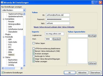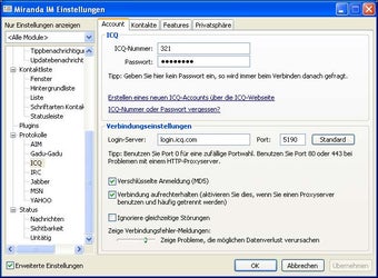 Wie die Desktop-Version verwaltet auch Miranda IM Portable Profile und Zugangsdaten unterschiedlicher Messenger-Programme. Nach der Installation auf dem USB-Stick gibt der Anwender die eigenen Kontaktdaten der verschiedenen Chat-Netzwerke an, darunter AIM, MSN, ICQ, Yahoo! und Jabber.